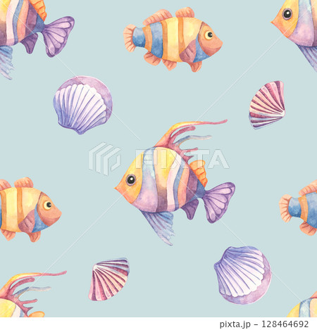 Striped fish, pink shells, and marine elements in watercolor clipart seamless pattern on soft aqua. Perfect for baby clothing, packaging, wallpaper, and underwater-themed decor