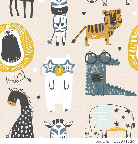 Seamless childish pattern with cute animals in black and white style. Creative scandinavian kids texture for fabric, wrapping, textile, wallpaper, apparel. Vector illustration