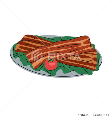 Bacon meat or American, English food on plate. Vector crispy fired pork slice served for breakfast or brunch meal. Side dish icon for salty cuisine. Snack or garnish. Grilled meal strips. Culinary.