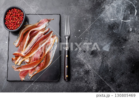 Cured dried duck breast meat slices, magret smoked poultry. black background. top view