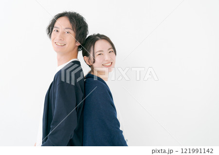 背中合わせでデバイスを操作するカジュアルな服の男女_カメラ目線1