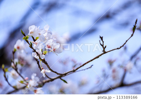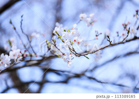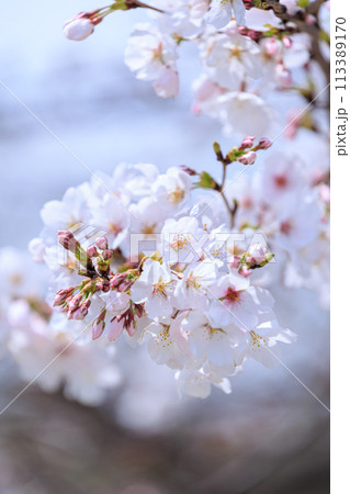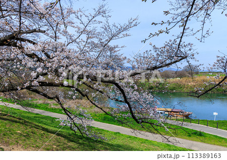 2024年春京都府八幡市背割り提の桜 青空と宇治川を背景に一分咲きの桜の木