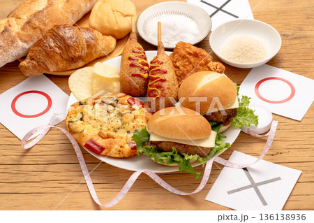 炭水化物と揚げ物が多い高血圧リスクの食事イメージ 丸バツ