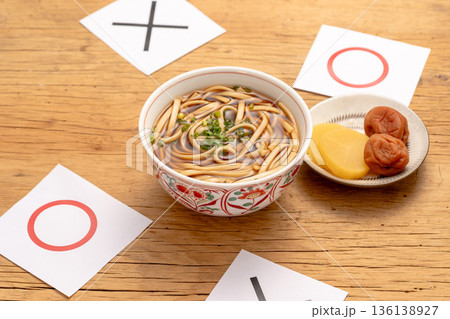 塩っぱいうどんと漬物の食事選択イメージ 丸バツ