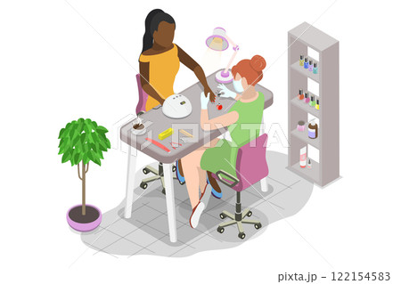 3D Isometric Flat Illustration of Manicurist, Female Client Receives Manicure from Beautician at Salon