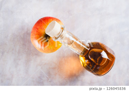 Close up of apple cider vinegar in a bottle on a fresh apple on the table top view