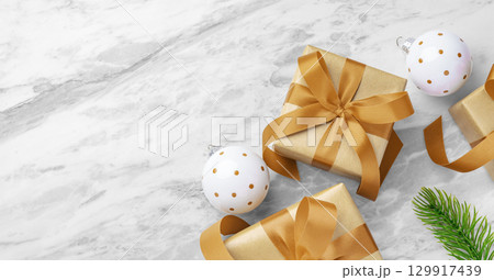 Christmas gift box with gold bow ribbon with xmas ball and tree on marble table background, top view