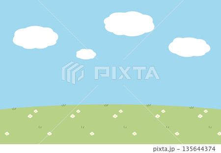 かわいい絵本風の青空と雲と草花の背景画像 晴れた空と草原のメルヘンな背景素材ベクターイラスト
