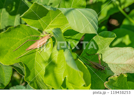 草の間に隠れるセスジツユムシ(褐色型)とマツムシ