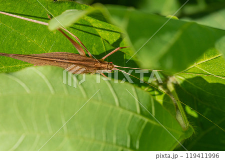 生き物 昆虫 セスジツユムシ、十一月中旬の雑木林で。褐色型もいるようです