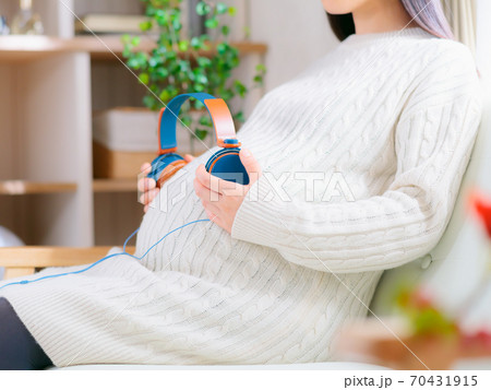 ヘッドフォンをお腹に当てる妊婦 胎教 4:3