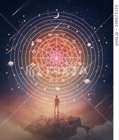 Marvelous scene with a person on the top of a mountain watching the astrological wheel projection on the starry night sky. Zodiac signs, magical horoscope symbols