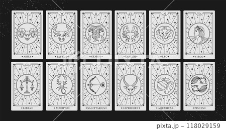 Zodiac cards. Astrology horoscope signs. Decorative magic spiritual calendar with predictions for media content. Fortune-telling. Mystic zodiac symbols frames. Vector concept