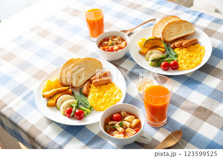 健康的な朝食、温野菜、野菜ジュース、洋食、ブランチ