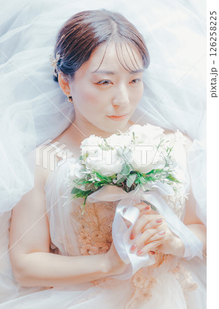 純白のドレスをまとい、ブーケを胸元に持って横たわる女性のイメージ写真