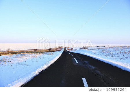 流氷が来た冬の北海道の能取岬にある灯台へ続く道