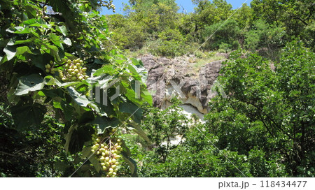夏の青空と笹川流れの青い日本海と粟島と船と奇岩