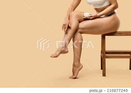 Young woman in underwear sitting on chair and applying moisturizer on legs