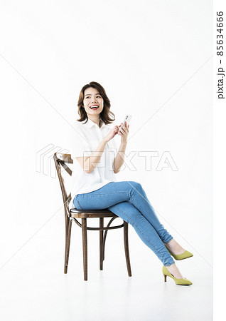 若い女性 スマホ 検索 白背景 座る カメラ目線