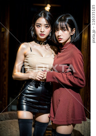 レザーのミニスカートとベージュのトップスの女性とボルドーのニットワンピースの女性が並んで立つ