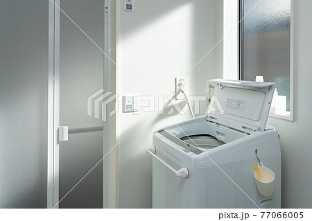 日の差し込む脱衣所・洗濯機・バスルーム