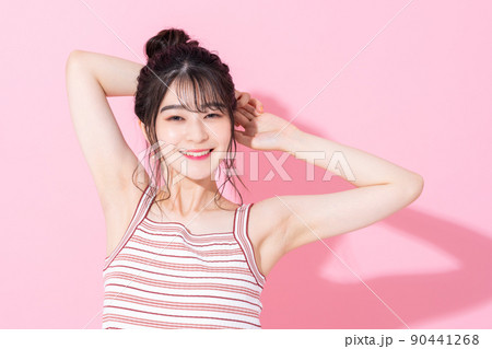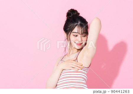 脱毛・ビューティー 脇の下を気にしている若い女性 上半身