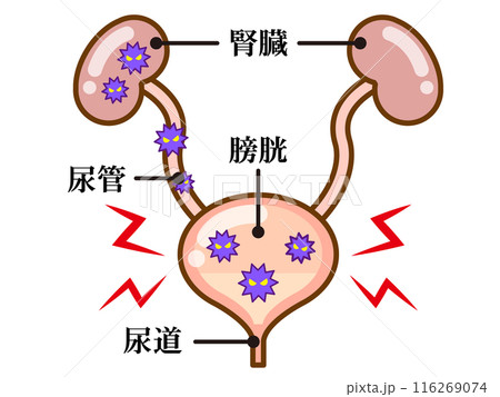 尿路結石でつらそうな腎臓と膀胱のイラスト 名称あり
