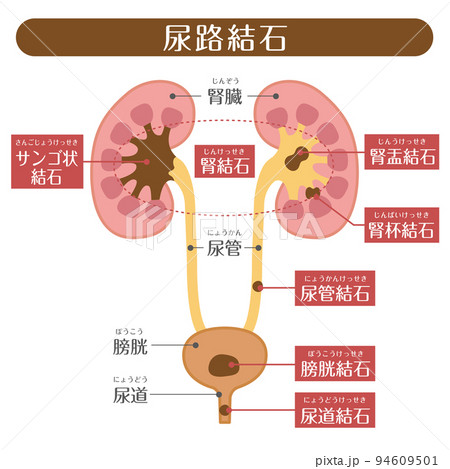 尿路結石でつらそうな腎臓と膀胱のイラスト 名称あり