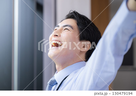 窓際でストレッチする休憩する爽やかなビジネスマン男性のクローズアップ スッキリした表情
