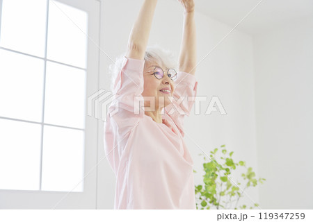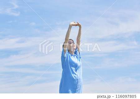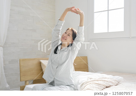 自宅でパジャマを着て伸びをするミドルエイジの女性