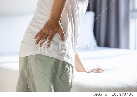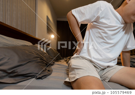 Stressed asian man having a backache,muscle pain,discomfort, unhappy adult people waking up at night with back pain on uncomfortable mattress or bad posture,health care,medical and lifestyle concept