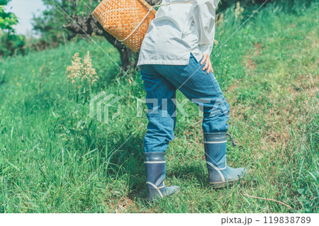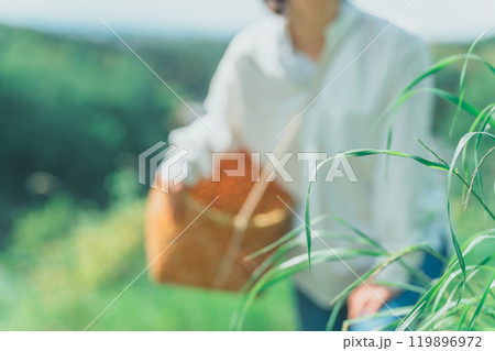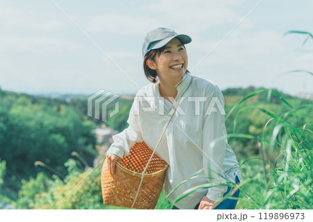 野山で収穫する女性