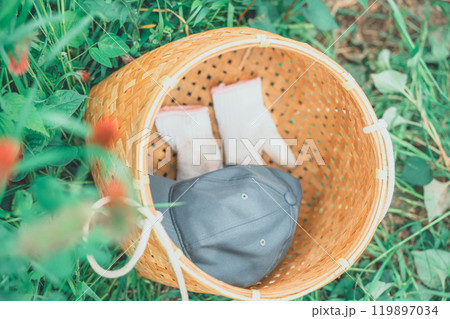野山に置かれた収穫かごの中の軍手と帽子