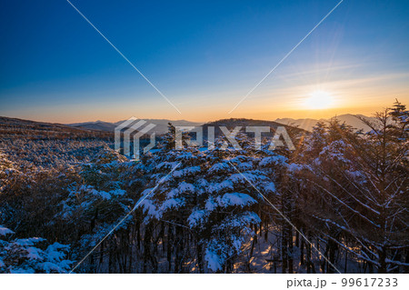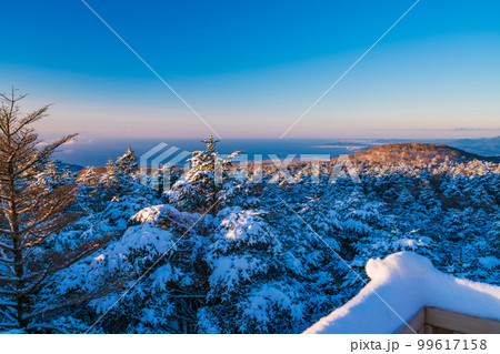 (静岡県)降雪した水ヶ塚公園・腰切塚展望台から望む、箱根方面 日の出