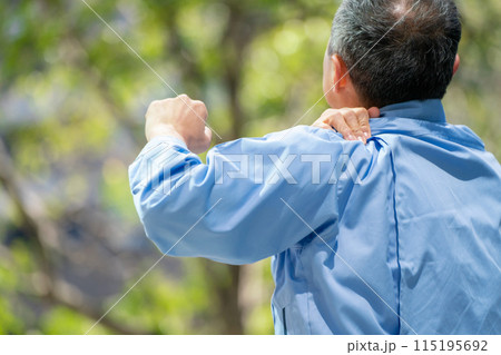 作業服の男性 ストレッチ 肩