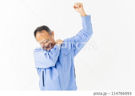 作業服の男性 ストレッチ 肩 アップ
