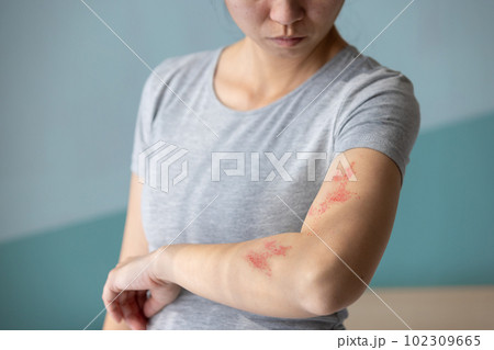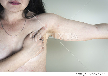 Women with symptoms of itchy urticaria or allergic reaction on the skin. Red rash on the females body.