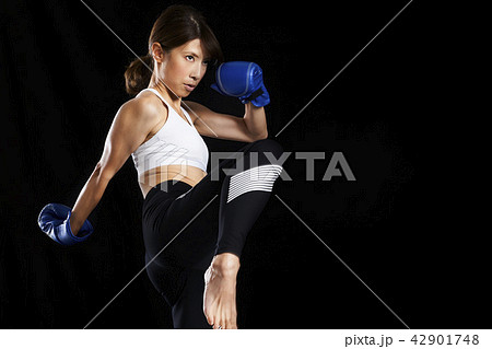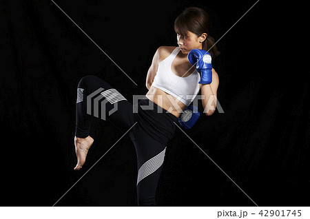 ジャンピングニーキックをする若い男性 トレーニング キックボクササイズ イメージ