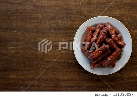 真上から見たテーブル背景の皿に盛った黒糖かりんとう(黒かりんとう)