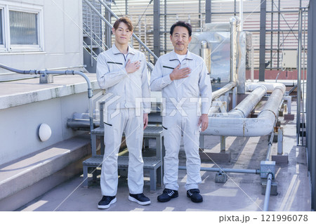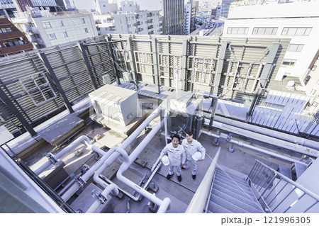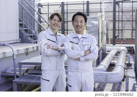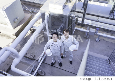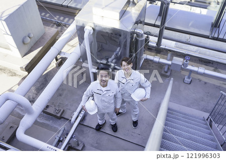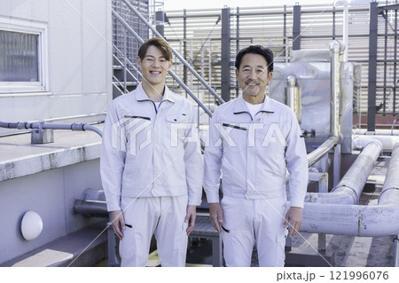 屋上の給排水設備の前に立つ作業服の男性2人 撮影協力:学校法人電波学園 東京電子專門学校