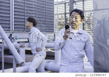 屋上の給排水設備の前でトランシーバーで話す作業服の男性 撮影協力:学校法人電波学園 東京電子專門学校
