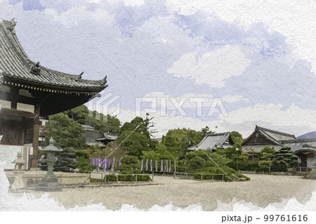 水彩画風 叡福寺 西方院から叡福寺を望む 大阪府南河内郡太子町