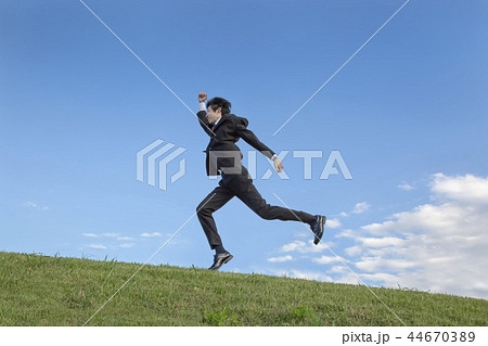 青空をバックに坂道を駆け上るスーツ姿の若いビジネスマン1人の横姿。競争・目標・元気・挑戦イメージ