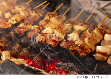 炭火で焼く豚肉と玉ねぎの焼き鳥 業務用グリル 煙と炎の臨場感あるシーン 居酒屋・屋台イメージ