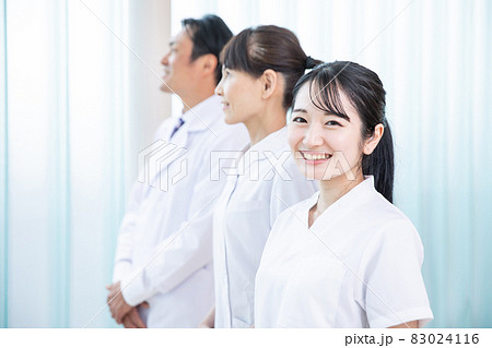 病院にいる医療スタッフ(横顔・3人・中高年ナース)