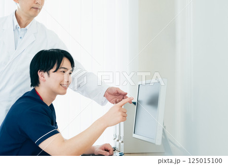指導医の男性医師とパソコンで電子カルテを見ながら教育を受ける研修医の女性医師