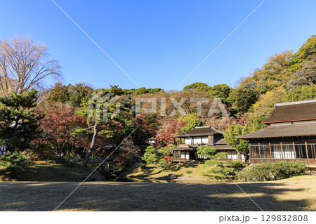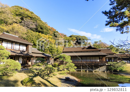 紅葉した木々と三渓園