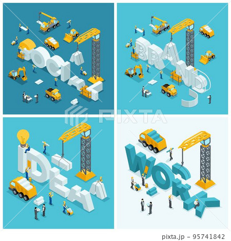 Set 2 Isometric construction concept, working people, construction equipment, excavator, truck, tractor, construction crane, a set of construction elements