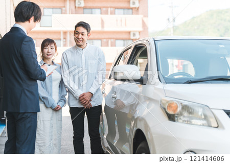 自動車購入・査定・買取にきた夫婦と接客するセールスマンの若いアジア人男性