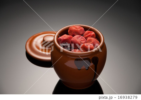 白背景に映える壺入りの梅干し